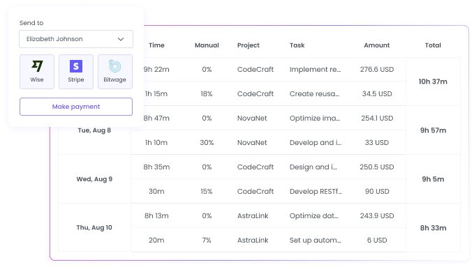 To pay your employees on WebWork, you can use Stripe, Wise, and Bitwage.