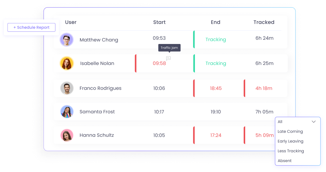Our time tracker monitors when your employees are late or finish earlier than required. Every time they start work late or finish it early, the time tracker opens a pop-up informing and asking them for the reason. In Attendance Reports, you get to see each employees’ reason for being late or finishing early.